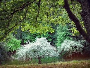 house, trees, Icecream, viewes, lake, snow, winter, birch