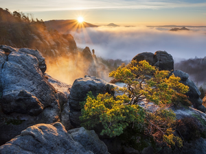 trees, viewes, autumn, Yellowed, grass, Stones, River, Bush