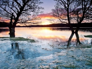 frosty, winter, viewes, cane, trees, lake
