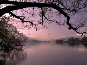 Mountains, trees, Houses, viewes, forest, Fog, Pond - car