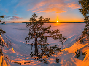 viewes, woods, Great Sunsets, trees, Mountains, Meadow, clouds