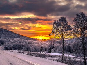 Meadow, west, viewes, clouds, trees, sun