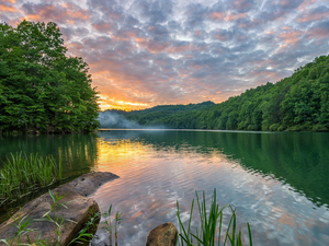 trees, forest, viewes, Fog, County Derbyshire, England, Stones, Peak District National Park, mossy