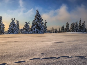 lupine, Meadow, viewes, Fog, trees, Flowers