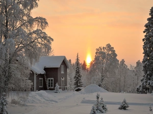 Sky, snow, Mountains, Bush, winter, Great Sunsets, Fog