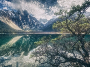 trees, rocks, pine, Fog, Mountains, viewes, Bush