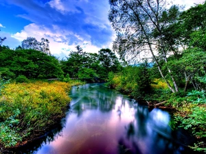 viewes, dry, Sunrise, Fog, water, trees