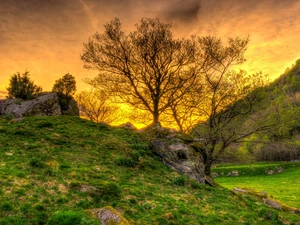 Sunrise, Flowers, viewes, Fog, Wildflowers, trees, Meadow