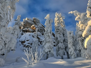 trees, viewes, day, snowy, sunny, Mountains, winter, forest