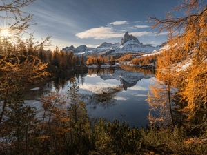 Spruces, winter, Great Sunsets, clouds, The Hills, forest