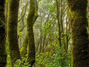 trees, Mountains, Houses, forest, winter, viewes, Fog