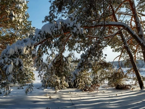 trees, snow, Mountains, forest, winter, viewes, clouds