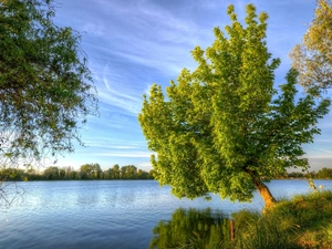 forest, trees, Houses, viewes, Stones, Peder Mork Monsted, painting, River