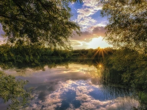 forest, Sunrise, viewes, rays of the Sun, trees, winter
