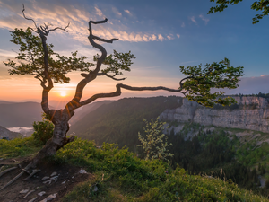 viewes, trees, Sky, Fog, Azaleas, morning, forest, Mountains, Sunrise, The Hills, Flowers, car in the meadow