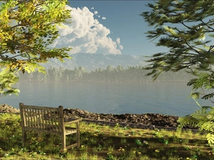 morning, rays of the Sun, Meadow, stream, viewes, clouds, grass, trees, Flowers