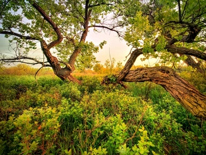 woods, Stones, west, grass, River, clouds, sun