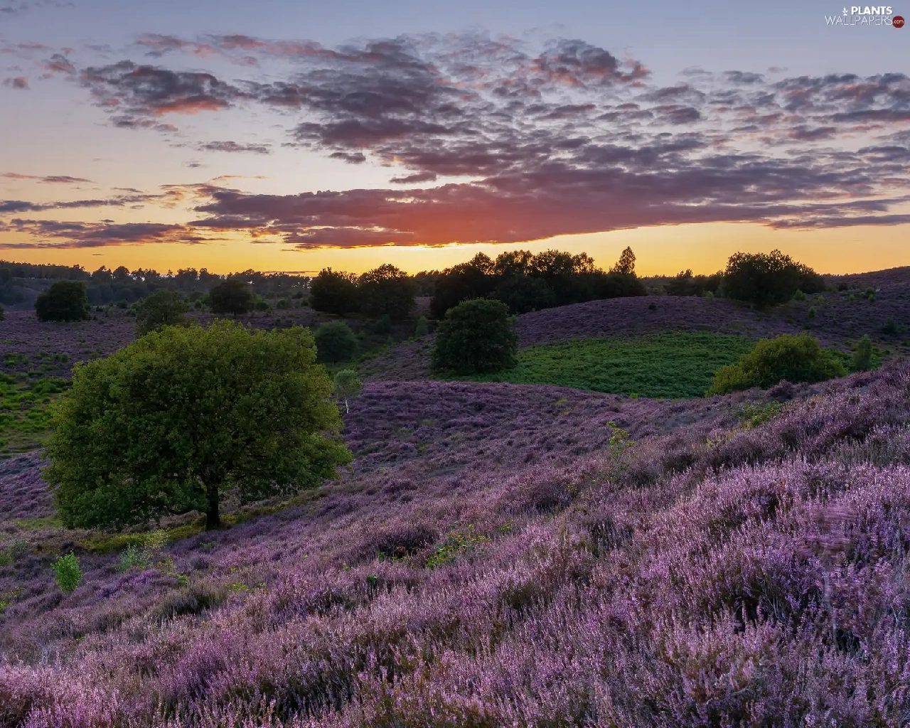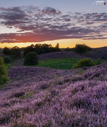 heathers, heath, trees, viewes, Province of Gelderland, Netherlands, Great Sunsets, Veluwezoom National Park, clouds