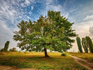 viewes, light breaking through sky, forest, trees, Green