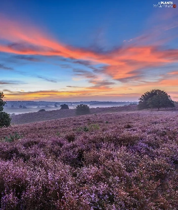 Veluwezoom National Park, heath, Province of Gelderland, Netherlands, viewes, clouds, Fog, trees, heathers