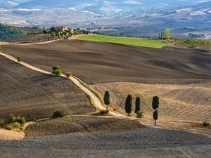trees, winter, Way, viewes, ligh, luminosity, flash, Snowy, The Hills, sun, Przebijające