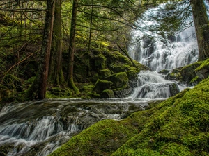forest, wooden, trees, house, winter, Snowy, viewes