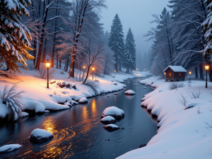 bridge, winter, viewes, trees, Stones, Great Sunsets, Mountains, River, Houses, snow, forest