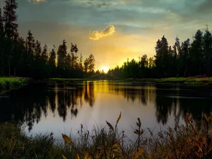 trees, Mountains, east, Islet, lake, viewes, sun