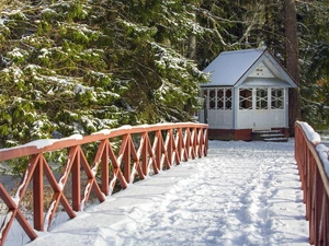 lake, forest, Great Sunsets, Snowy, viewes, Mountains, winter, trees