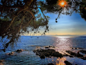 coast, grass, Sky, rushes, cloudy, Boat, autumn, lake