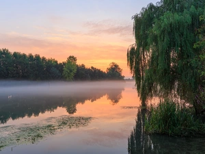 Ladoga, Karelia, trees, lake, Russia, rocks, clouds