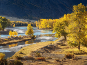 trees, viewes, morning, color, Fog, forest, autumn, Leaf