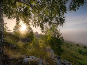 viewes, forest, Brown, Leaf, Fog, trees