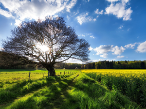 trees, lake, Przebijające, viewes, sun, autumn, luminosity, Boat, Platform, flash, ligh