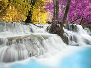 trees, stream, Przebijające, viewes, sun, Spring, luminosity, Stones, mountainous, flash, ligh
