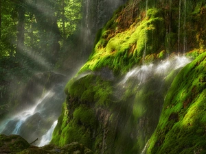 sun, ligh, flash, Spruces, viewes, luminosity, Przebijające, Way, sunny, morning, trees, forest