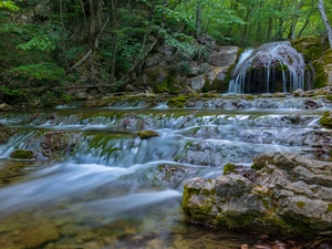 mossy, trees, River, Stones, waterfall, forest, viewes, Plants, rocks, cascade