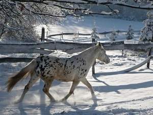 viewes, winter, Hazy, Spruces, lake, The United States, Washington State, trees, Snowy, Mount Rainier National Park, Mountains