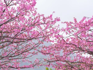 Mountains, Hazy, Snowy, Spruces, luminosity, shadow, sun, flash, ligh