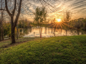viewes, autumn, lake, Platform, forest, trees
