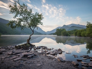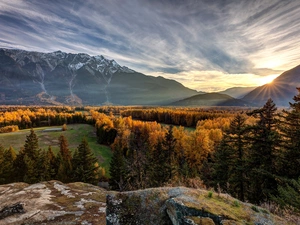rays of the Sun, winter, viewes, River, trees, Fog