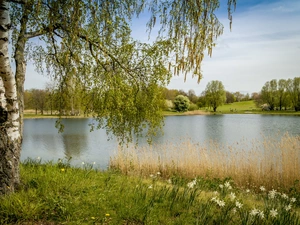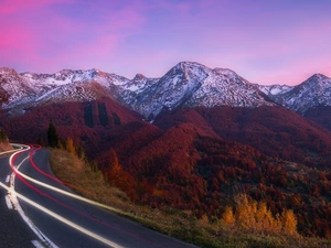 trees, Mountains, lake, Fog, Great Sunsets, viewes, reflection