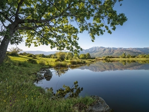 viewes, River, clouds, reflection, grass, trees