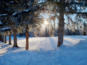 snow, trees, Fog, viewes, Bush, winter, River, light breaking through sky