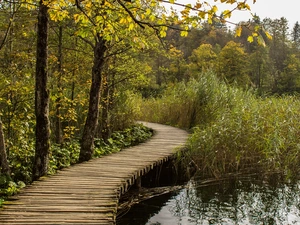 viewes, forest, Sky, colors, Stones, trees, autumn, River