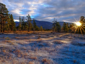 Stones, mountains, viewes, River, autumn, trees, Larches