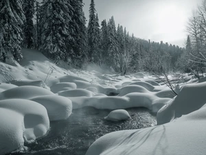 trees, Mountains, Stones, River, viewes, Yellowed