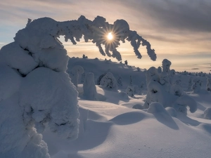 trees, viewes, winter, snow, Great Sunsets