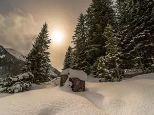 Snowy, Mountains, viewes, snow, winter, trees, lake