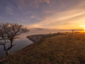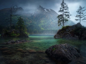 Mountains, River, viewes, Stones, trees, Snowy, winter, snow